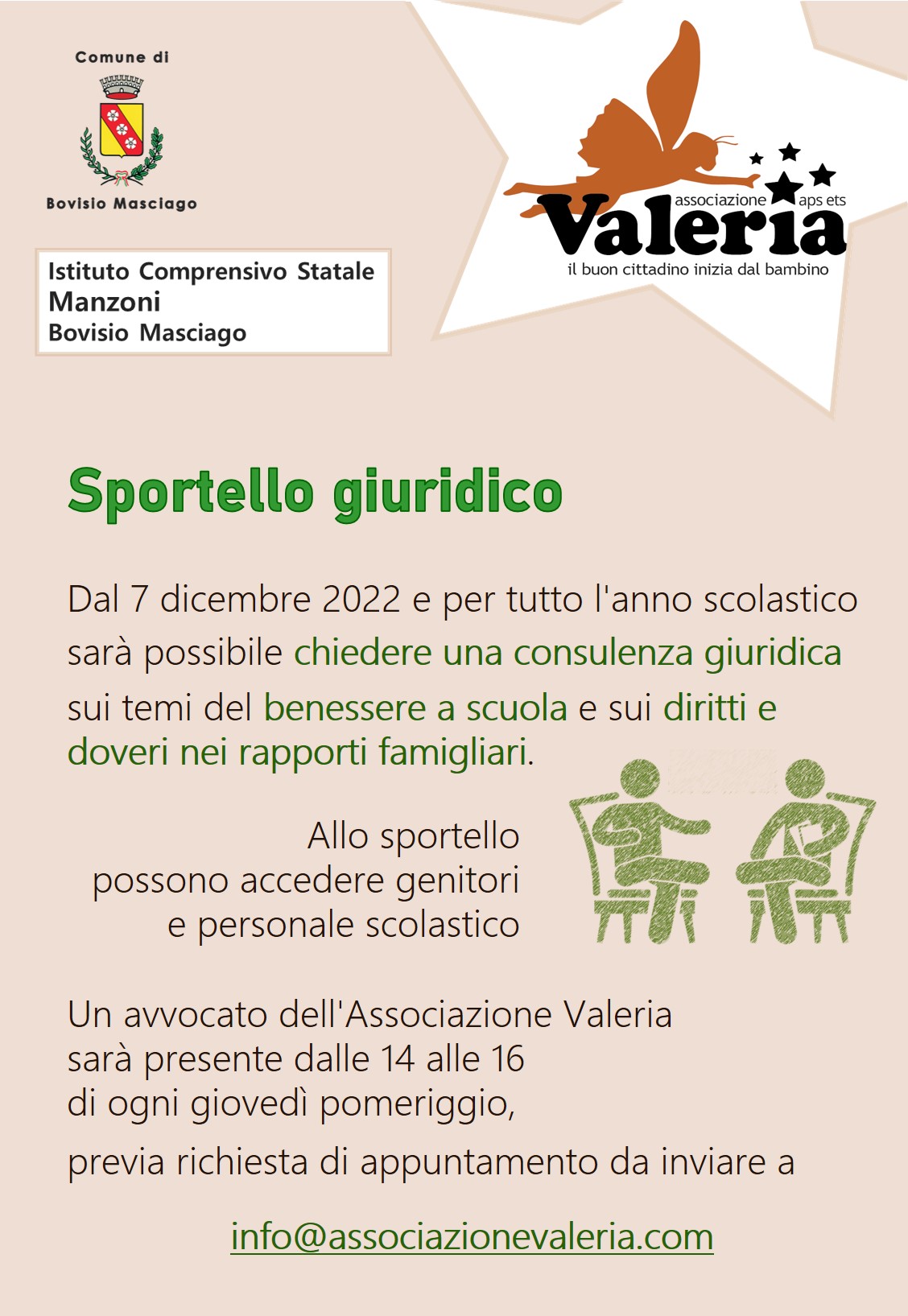 A partire da quest’anno, all’interno della progettazione che ha come finalità lo star bene a scuola, è stato attivato uno Sportello giuridico presso l’Istituto Comprensivo Statale Manzoni di Bovisio Masciago. I genitori degli alunni e i docenti potranno chiedere una consulenza giuridica sui temi del benessere a scuola e sui diritti e i doveri nei rapporti familiari; l’obiettivo è quello di fornire strumenti di sostegno e orientamento in materia giuridica che possano aiutare chi si occupa di bambini e ragazzi.