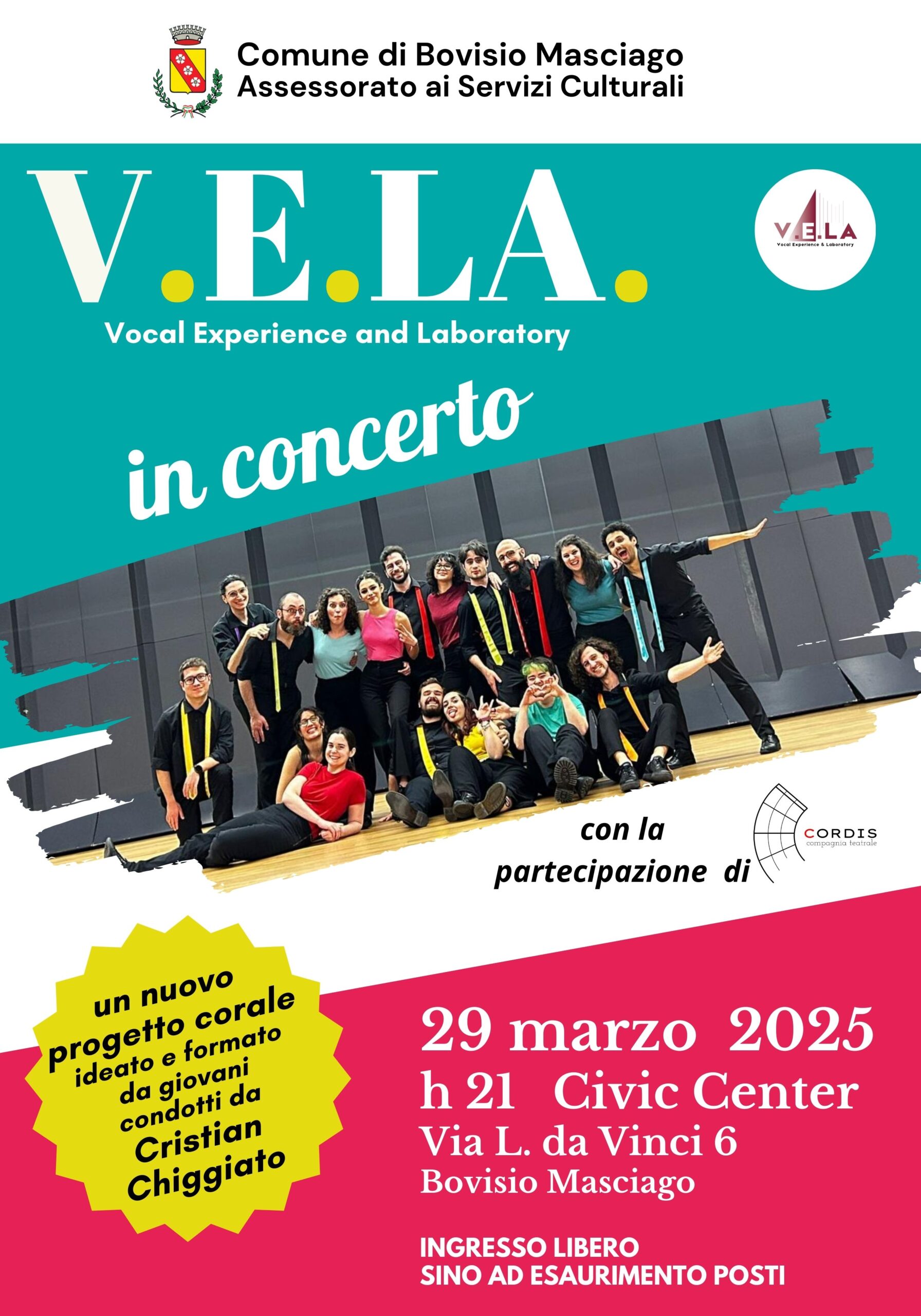 V.E.LA. è progetto corale ideato e formato da giovani che condividono la passione per la musica condotti da Cristian Chiggiato; il loro nome vuole evocare l’entusiasmo di mettersi in viaggio ma è anche l’acronimo per Vocal Experience and Laboratory (Vocal Experience perché credono veramente che l’esperienza del cantare in coro possa cambiare la vita e Laboratory perché vogliono sperimentare molti generi musicali e quanto la coralità ha da offrire).